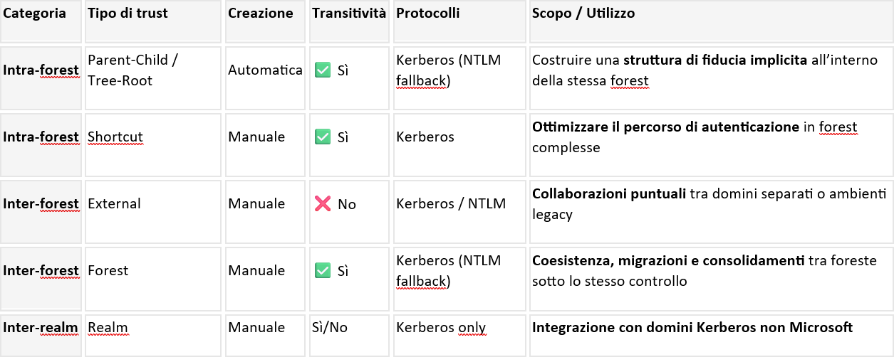 Come eredità delle Domain Trust nascono le External Trust: collegamenti espliciti, non transitivi, volutamente limitati. Un compromesso necessario, pensato per contenere il rischio e ridurre l’esposizione.